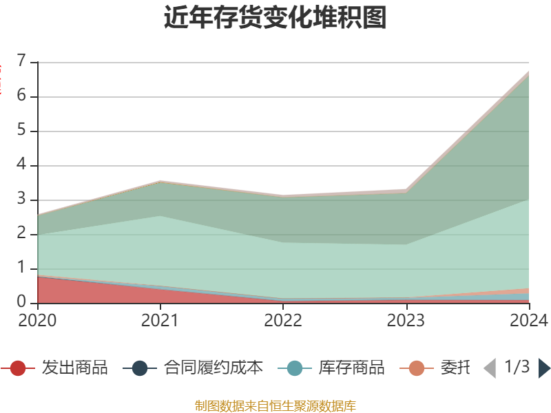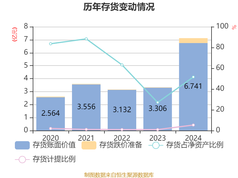从存货变动来看,截至2024年末,公司存货账面价值为6.74亿元,占净资产的51.58%,较上年末增加3.43亿元。其中,存货跌价准备为3776.07万元,计提比例为5.3%。